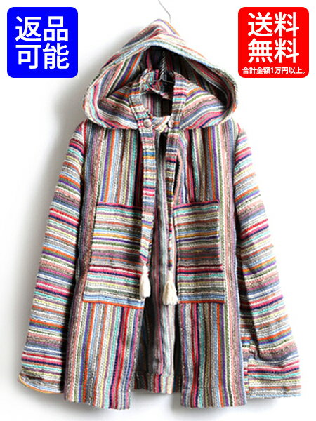 70's ビンテージ ■ QUATRE 脱着 フード マルチカラー ストライプ ガウン コート ( メンズ レディース S 程) 古着 メキパ ローブ 羽織り| 【USA古着】中古 ポケット 付き 総柄 ネイティブ柄 男女兼用 メキシカンパーカー ガウン コート ハーフコート ジャケット