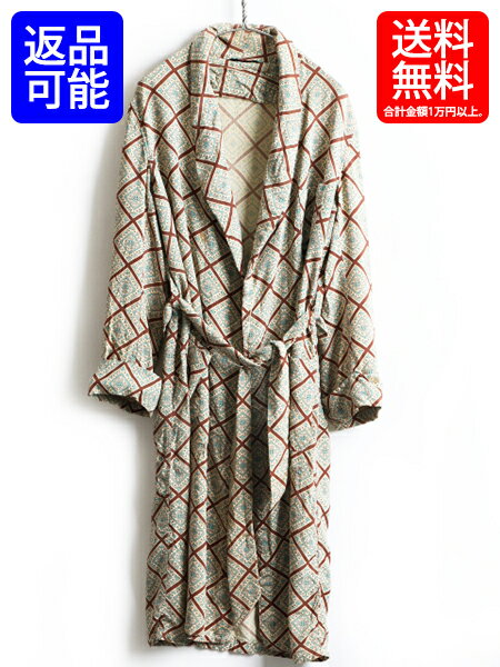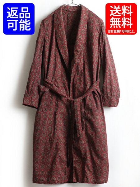 60's ビンテージ ■ ブランド不明 総柄 コットン ロング ガウン コート ( 男性 メンズ M 程) 古着 ロングコート 60年代 ロング丈 ローブ| 【USA古着】中古 ルームウェア ロングガウン ガウンコート マルチカラー ベルト付き 薄手 バーガンディ ワインレッド