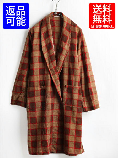 60s ビンテージ ■ Royal Crest Casuals チェック プリント フランネル ロング ガウン コート ( メンズ レディース M ) 古着 ロングコート| 【古着】中古 ルームウェア ロングガウン ガウンコート ジャケット ローブ ポケット付き ネル 茶 ブラウン 赤 レッド 60年代